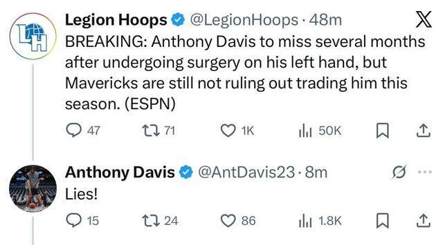 Shams表示,浓眉的左手韧带手术需要伤停数月,这意味着他本赛季大概率报销,而独行侠队方面则重启了交易,接手浓眉的下家球队计划让浓眉在季后赛期间复出。