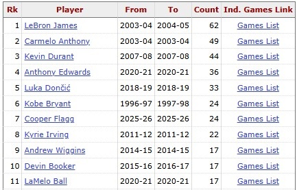 据统计,弗拉格已25次砍下20+,超越科比排名NBA历史青少年球员(16-19岁)20+场次数第6,在他身前的有詹姆斯、安东尼、杜兰特、爱德华兹和东契奇。