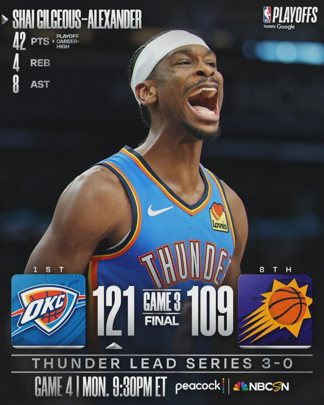 北京时间4月26日,今天凌晨结束的一场NBA季后赛:雷霆客场121-109击败太阳,总比分3-0领先。两队都有伤员休战:雷霆的杰伦-威廉姆斯和以赛亚-乔,太阳的马克-威廉姆斯和古德温。今年季后赛,马威因脚伤一场都没打。